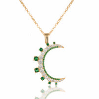 Crescent necklace made from sterling silver with 18k gold plating, green and clear cz stones on a 16-18 inch chain
